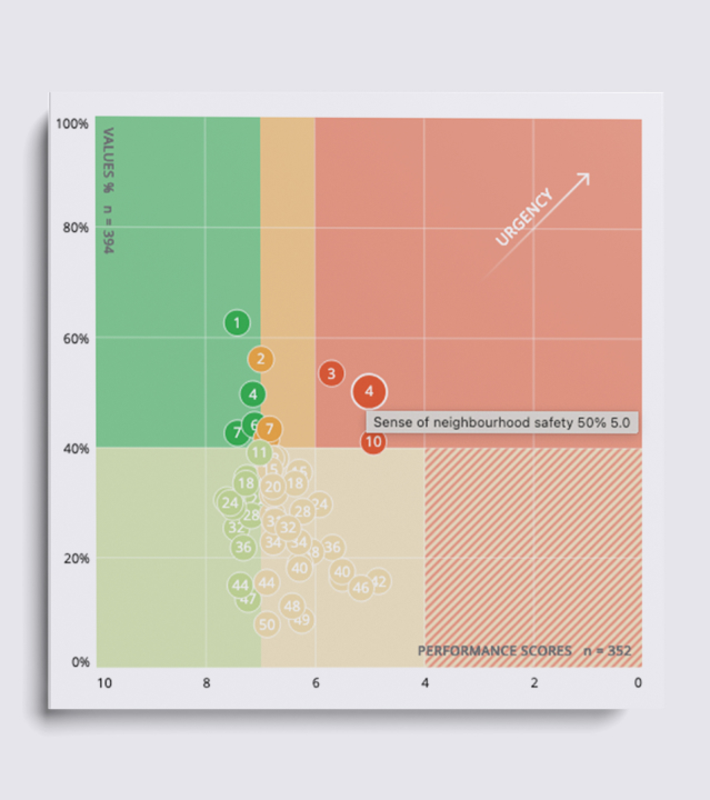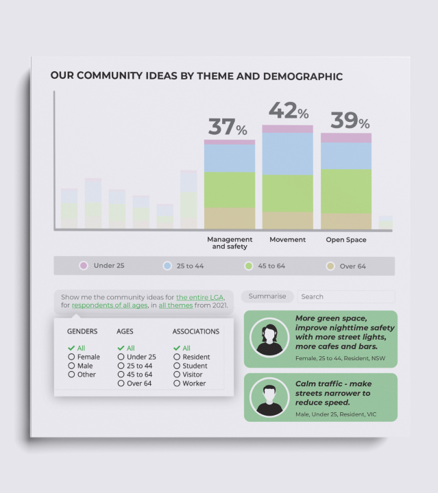 Our intuitive dashboard centralises every insight and piece of community feedback in one place. Your team can make smarter, evidence-based decisions – with filters to find results by place or persona, and benchmarks for comparison.