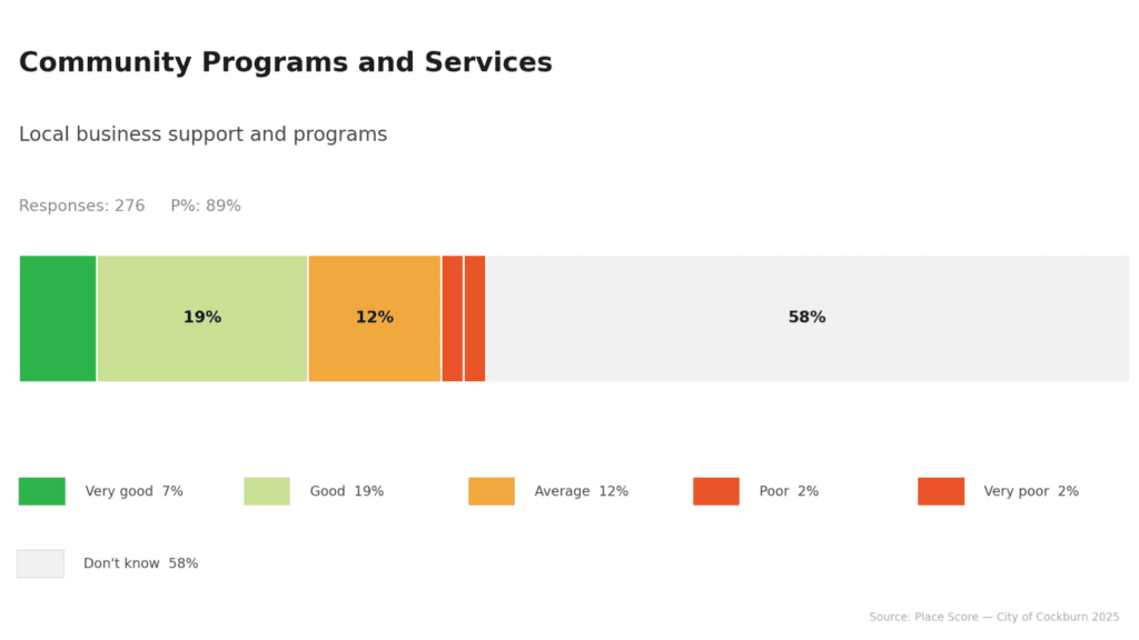 People can’t rate something they don’t know exists. Interestingly, one of Cockburn’s liveability priorities for improvement is locally owned and operated businesses, suggesting that awareness and visibility of local economic initiatives directly influence how people experience their community.