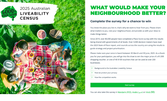 Every two years, the Australian Liveability Census opens on Neighbour Day, the last Sunday in March and closes on 30 June.